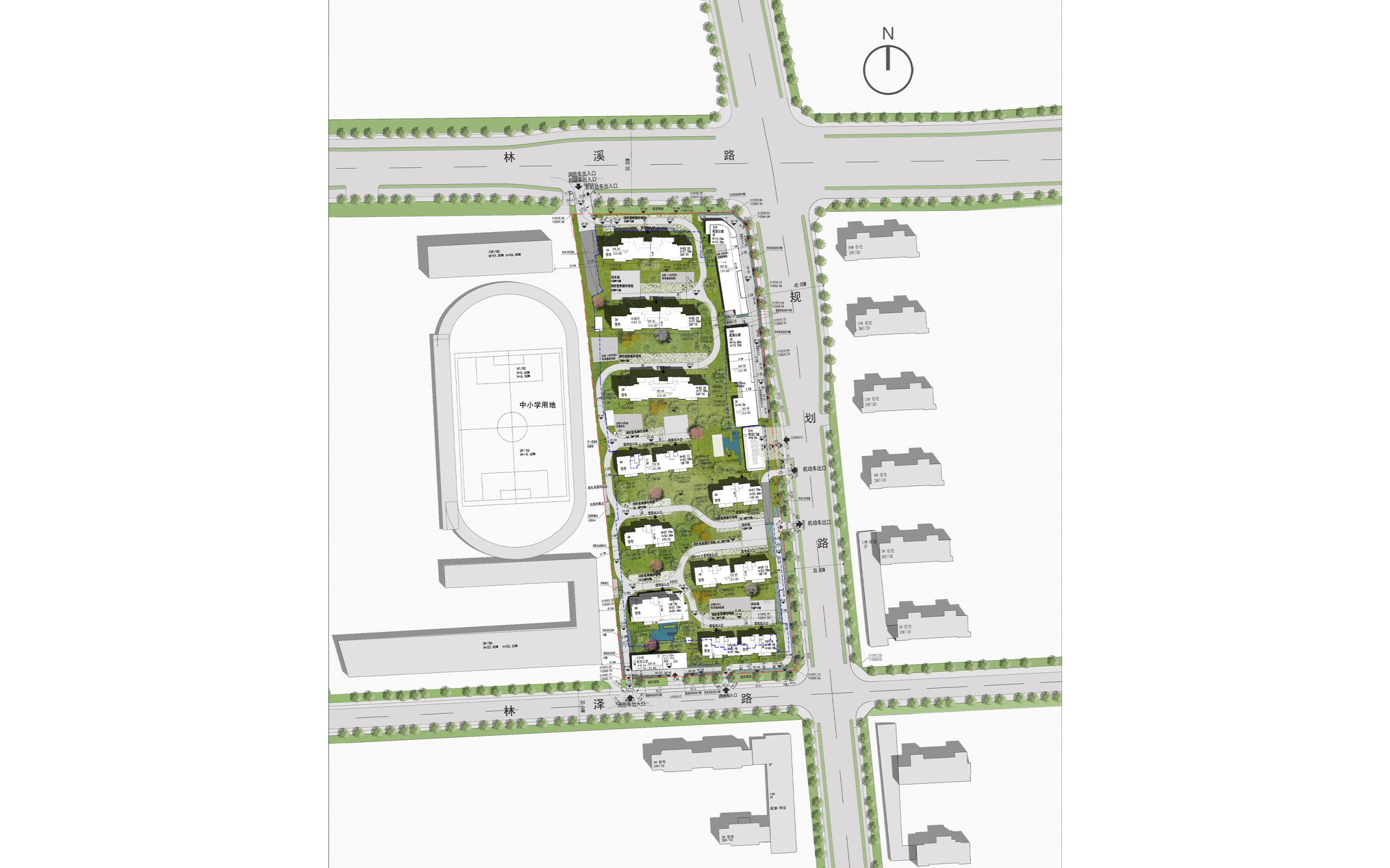 地块位于西安国际港务区,属于城市发展核心区,项目占地约3万m²,计容面积约7.6万m²,容积率2.5。地形呈现南北长,东西窄的地形特点,同时东侧及南侧均有已建和待建建筑的日照影响,地块综合影响因素较为苛刻,决定了本地块需要极其高效的用地策略,这一条件也成为我们一切设计思考的绝对起点.在用地北侧较为不利的日照条件下,最大限度利用发挥北侧用地,衍生出单栋大面宽住宅结合沿街商业的布局,达到住宅面宽资源最大化。通过整体精准的空间策略、灵活的功能布局和创新的建筑设计,将狭长地块的约束转化为特色优势,打造高效集约、充满活力的城市社区。